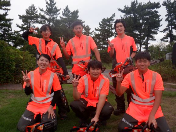9月13日・14日(土・日)、鳥取砂丘オアシス広場にて「令和7年度アカデミー・ジュニアクラス伐木競技交流会」が行われました。本大会は伐木・造材技術の向上と学校・生徒間の交流を図り、安全意識の高い人材を確保・育成するため、県内外の林業高校および林業大学校生を対象とした大会です。競技内容は、直径35㎝、7度に傾いた丸太を上下から段差なく正確に切る「丸太合わせ輪切り」と、長さ60~90㎝、太さ28~38㎝の丸太を立ち木に見立て、伐倒方向に向かって正確に受け口をつくる「簡易伐倒」の2種目です。1日目は練習会、2日目は代表選手による競技会が行われ、本校からも6名の生徒が参加しました。生徒たちは6月から競技会に向けて練習を重ね、技術を磨いてきました。当日も練習の成果を発揮することができ、1名が総合10位という結果になりました。