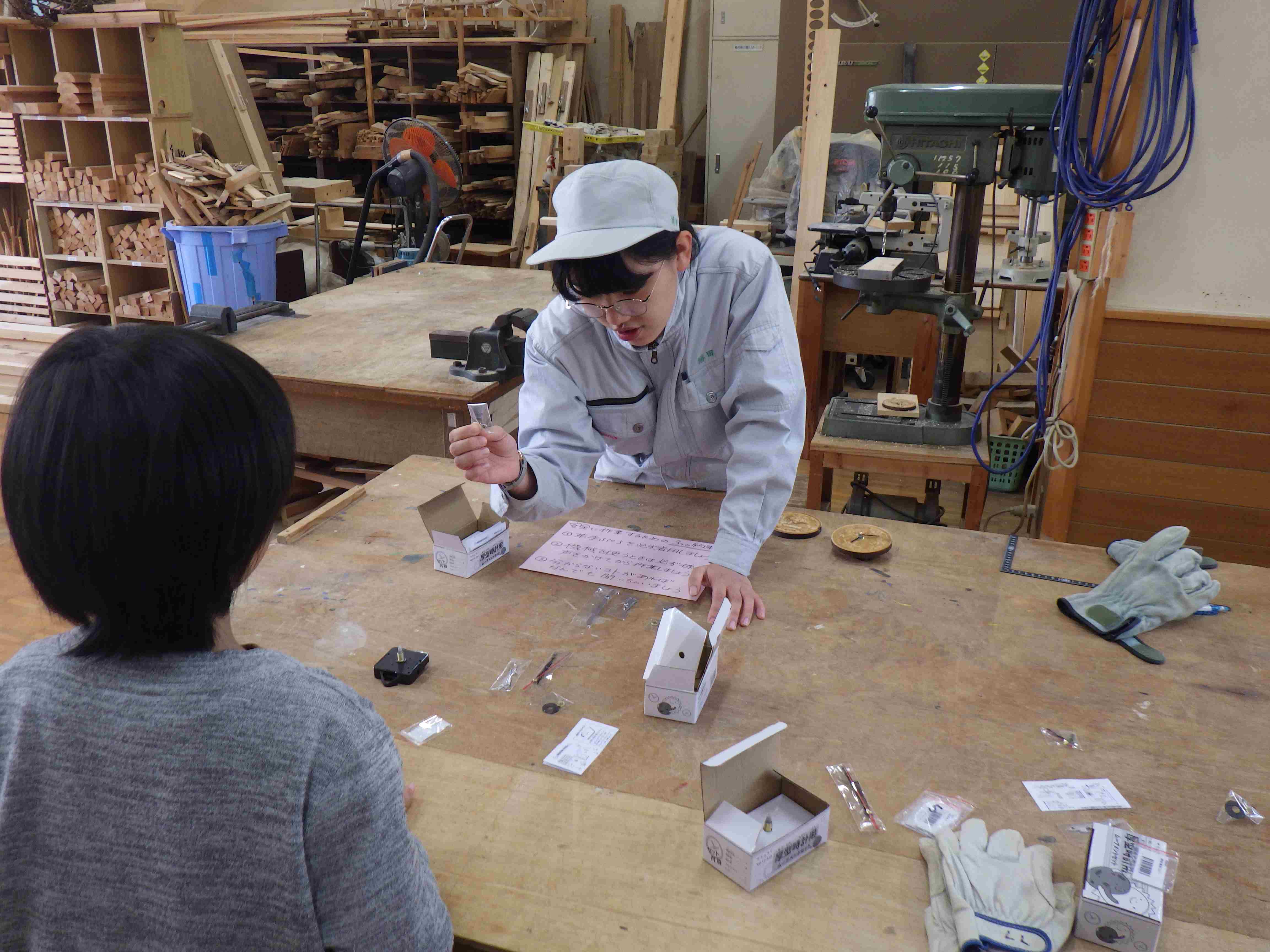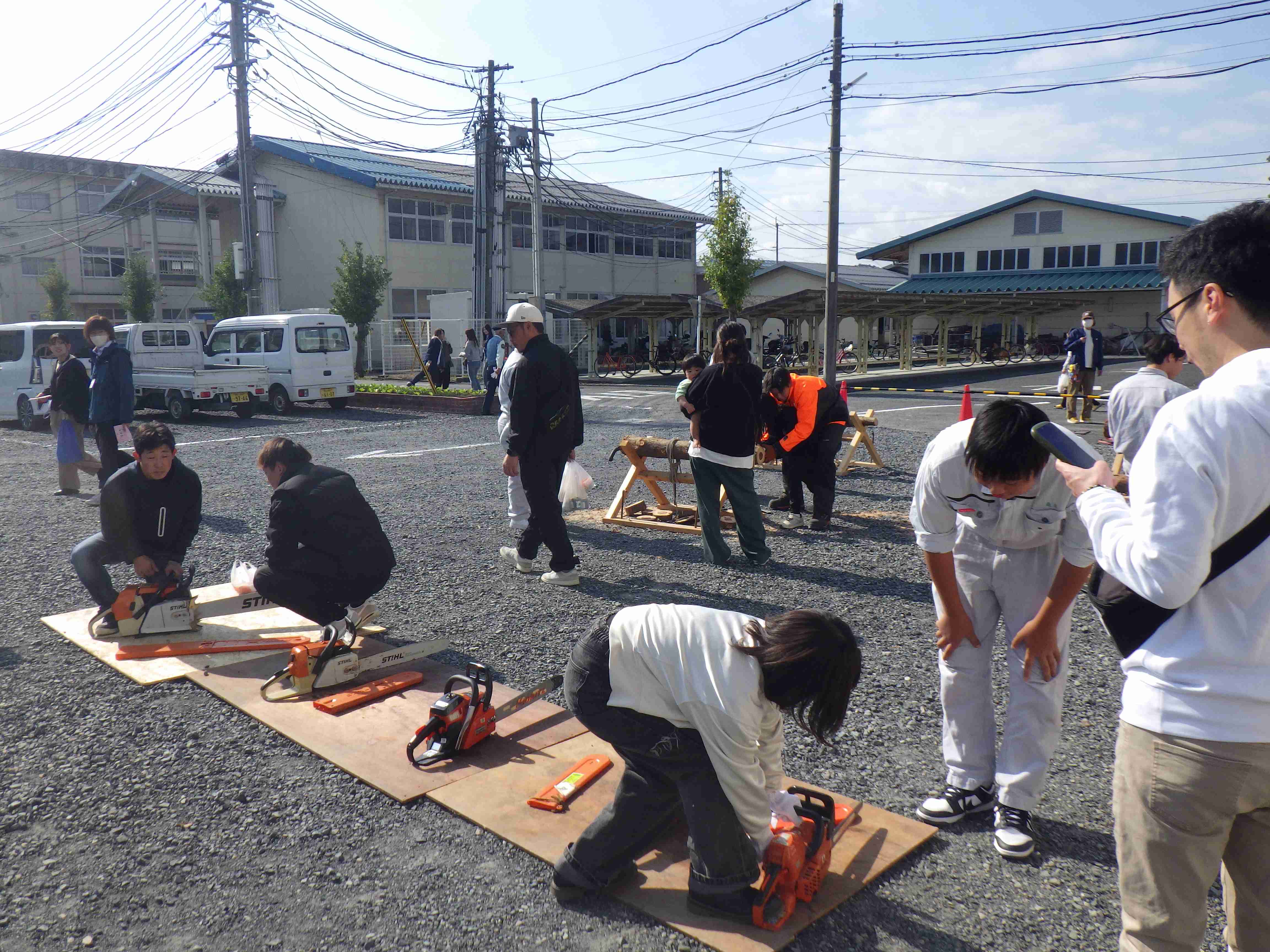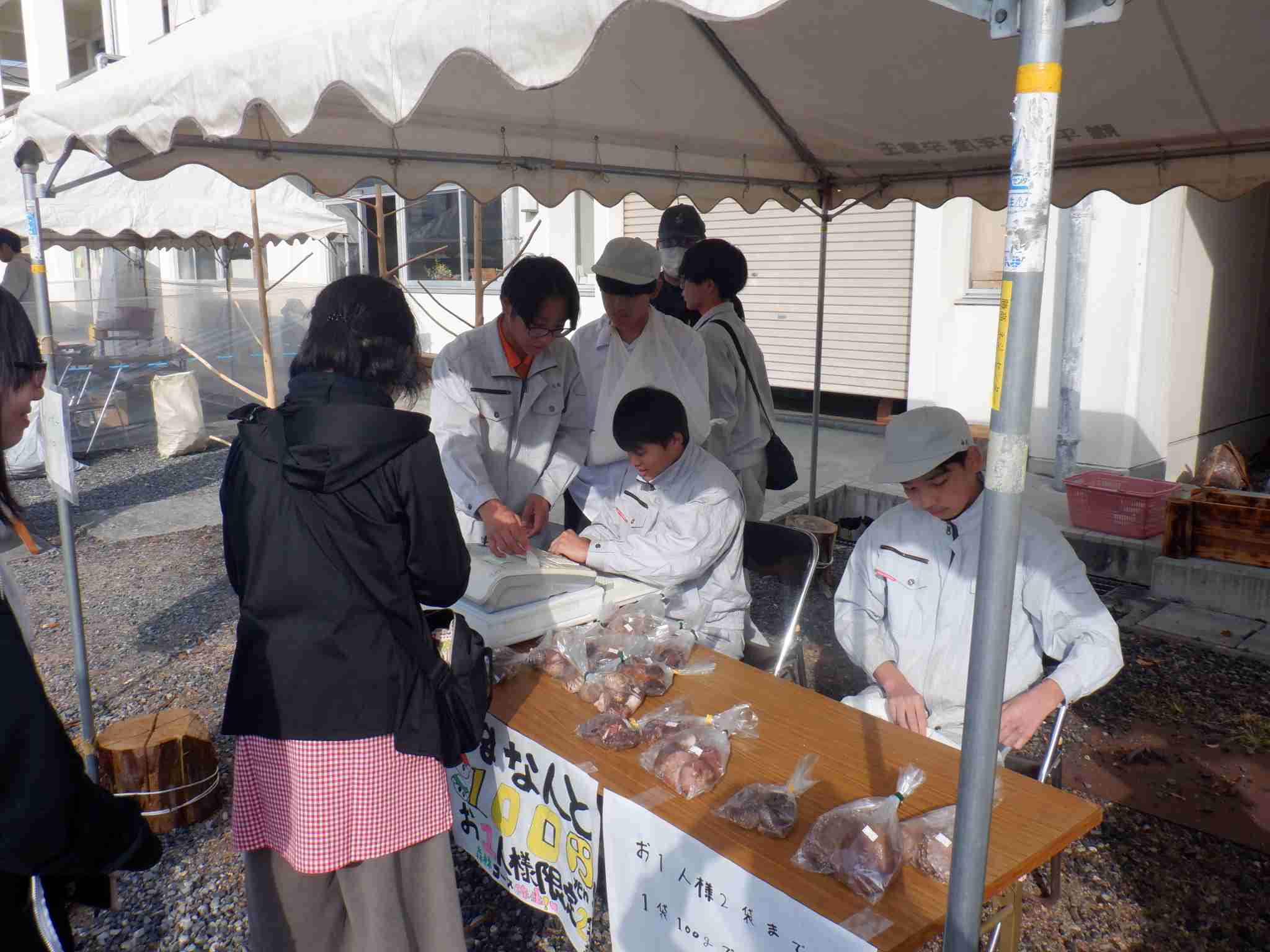 2年生の体験ブースでは、多くの方が初めて触れるチェンソーに悪戦苦闘しながら、生徒の指導の下、始動体験をしていました。1年生の販売では、しいたけは早々に完売し、木工品も多くの方にご購入いただきました。また3年生の模擬店も、長蛇の列ができ、大変好評をいただきました。