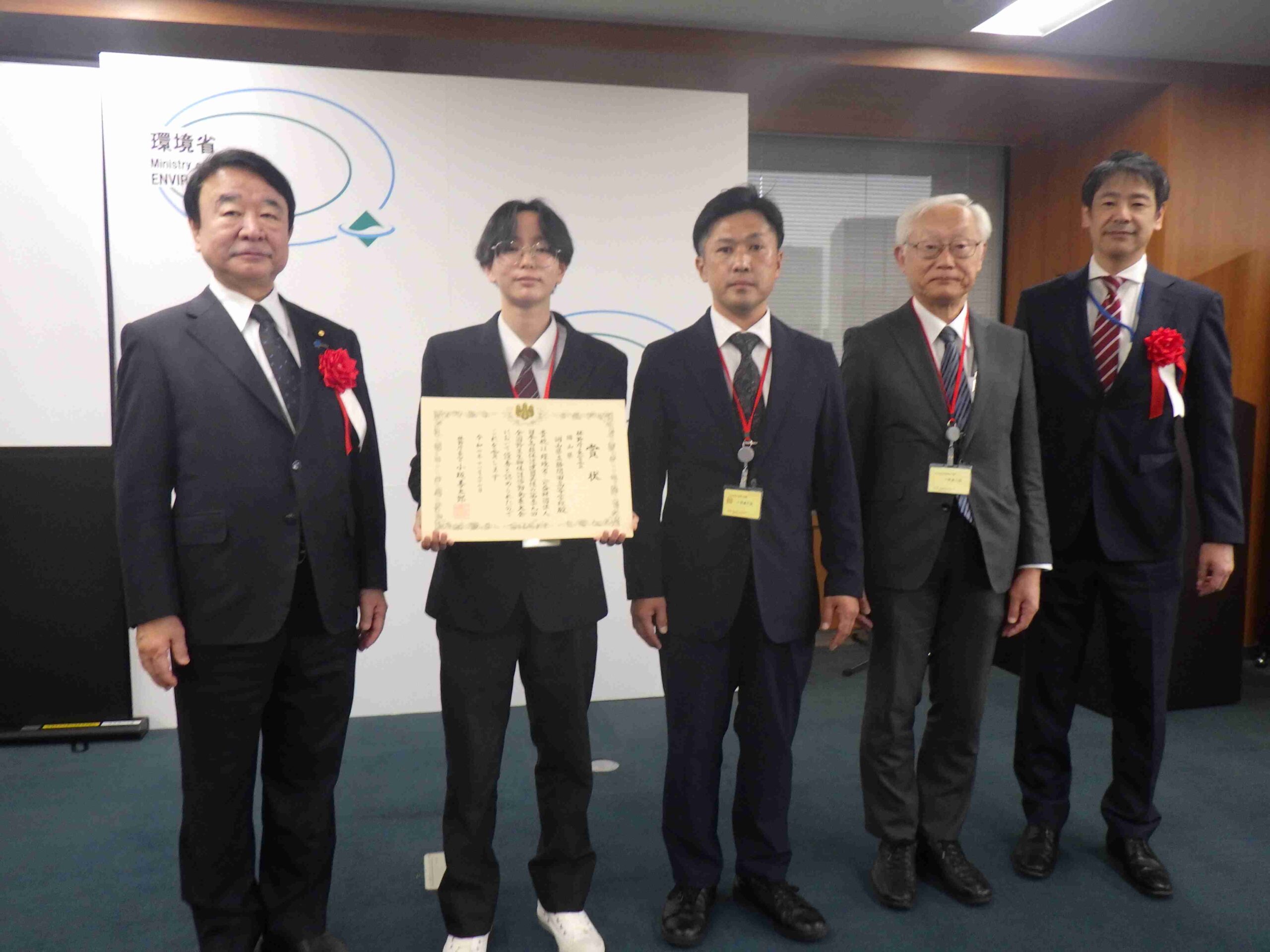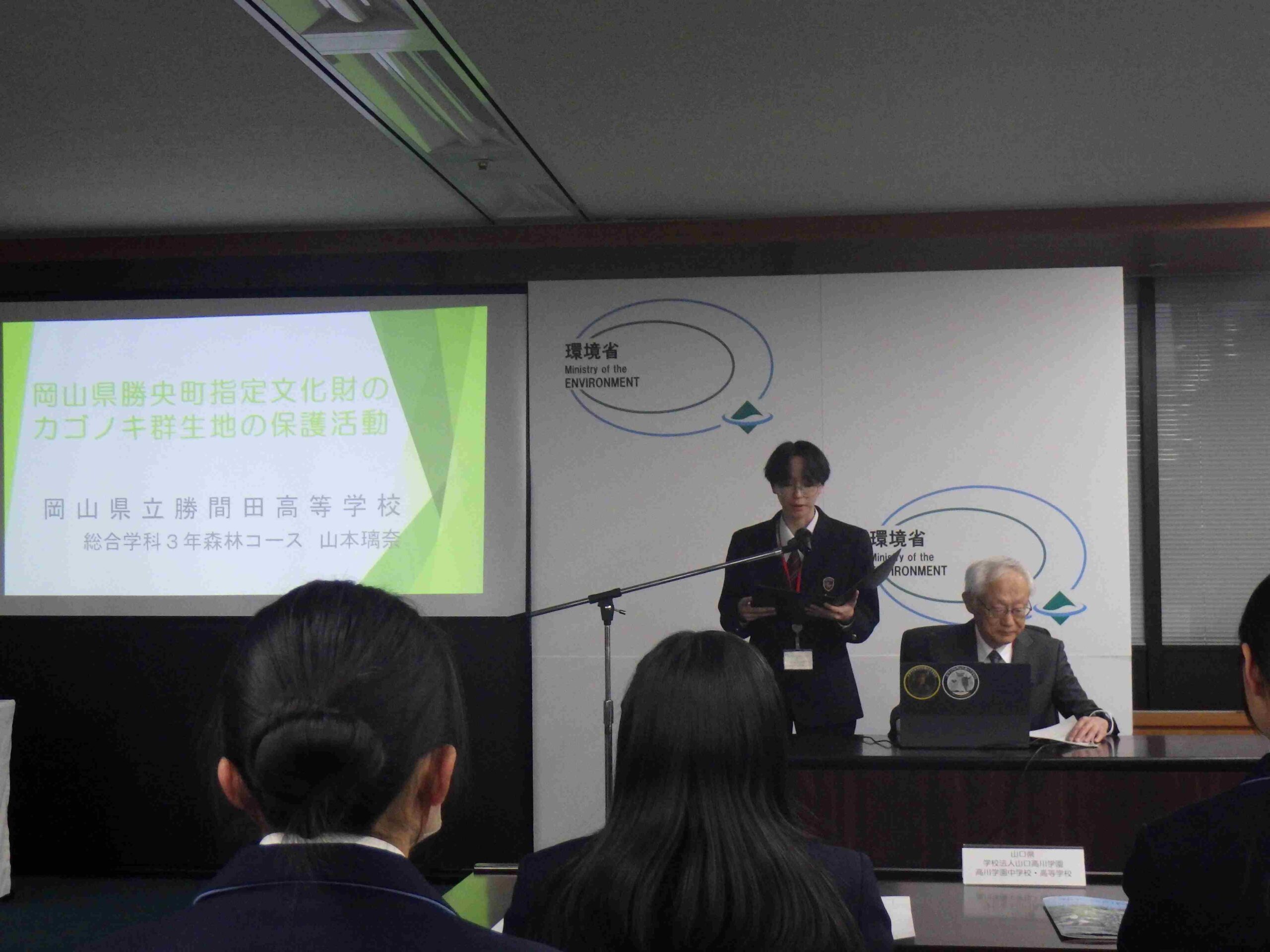 森林コースは、令和7年11月27日に環境省で開催された、第59回(令和7年度)全国野生生物保護活動発表大会に参加しました。発表内容は、平成28年から高母平山で実習している「カゴノキ群生地を守る活動」についてです。オンライン参加校も含めて、全国から9校が受賞校として発表し、勝間田高等学校には、「林野庁長官賞」が林野庁研究普及課から授与されました。