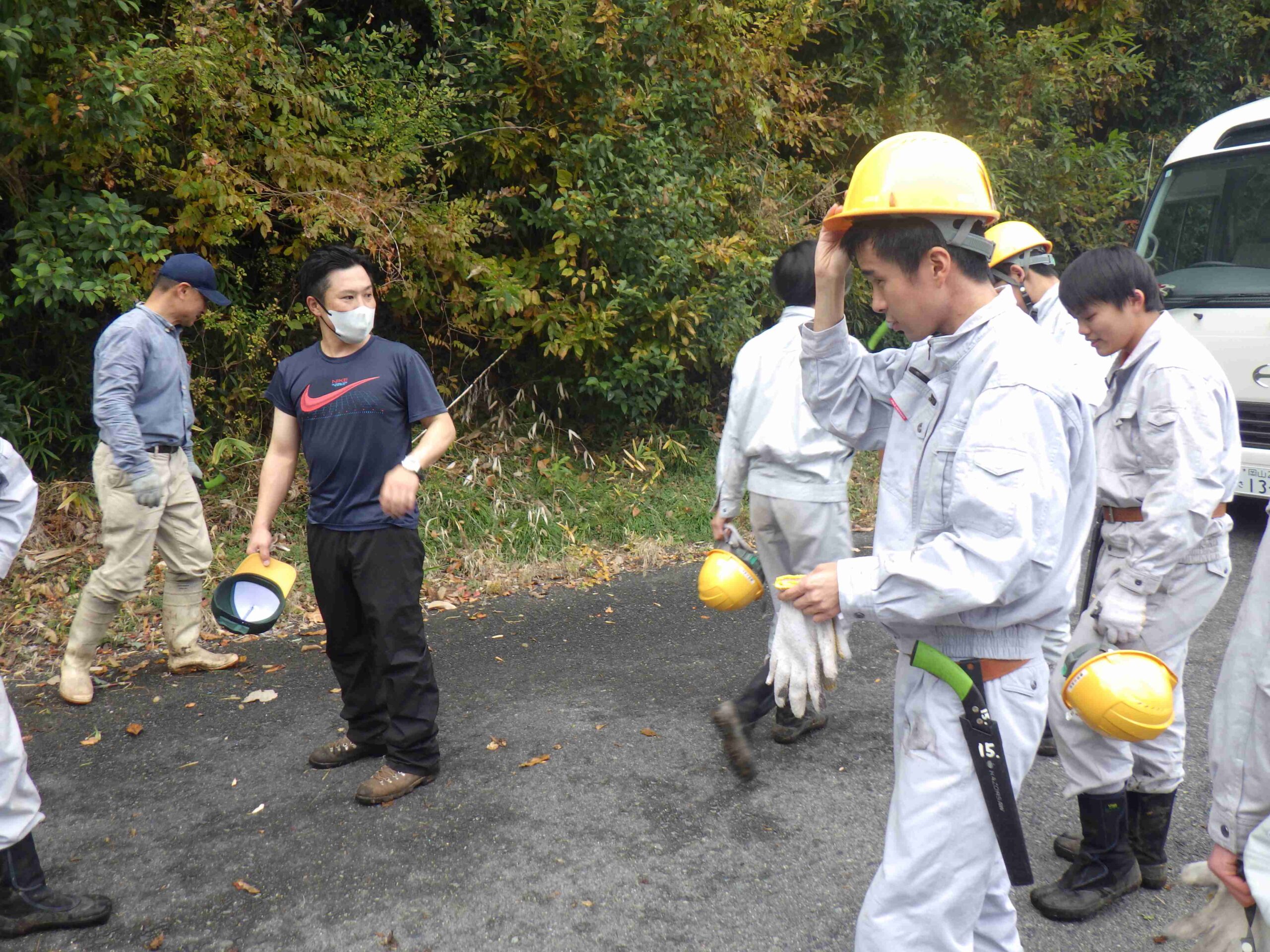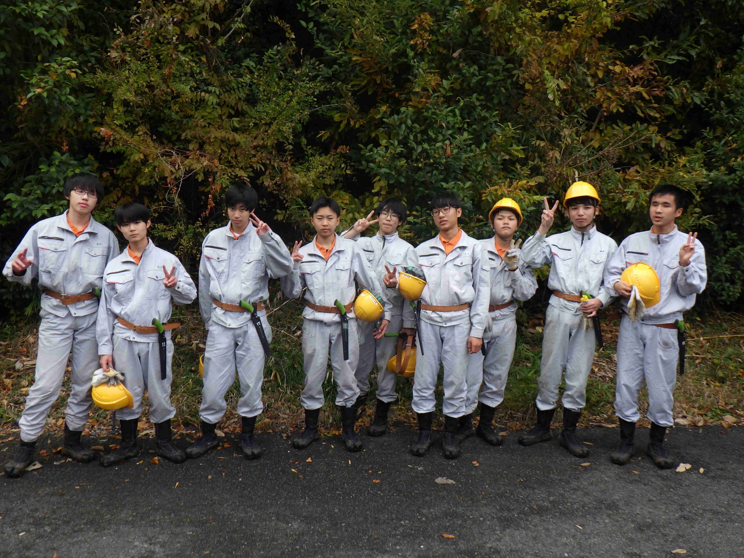 11月25日(火)、勝央町にある高母平山で、森林コース1年生がカゴノキ群生地の整備を行いました。森林コースでは毎年、町指定文化財であるカゴノキ群生地の整備として、竹の伐採を行っています。3つの班に分かれ、それぞれで伐採、玉切り、積み込みと作業を進め、作業が終わるころには、空が開き、光が差し込むようになっていました。平成28年から続くこの活動は、「第59回(令和7年度)全国野生生物保護活動発表大会」で「林野庁長官賞」を受賞しました。