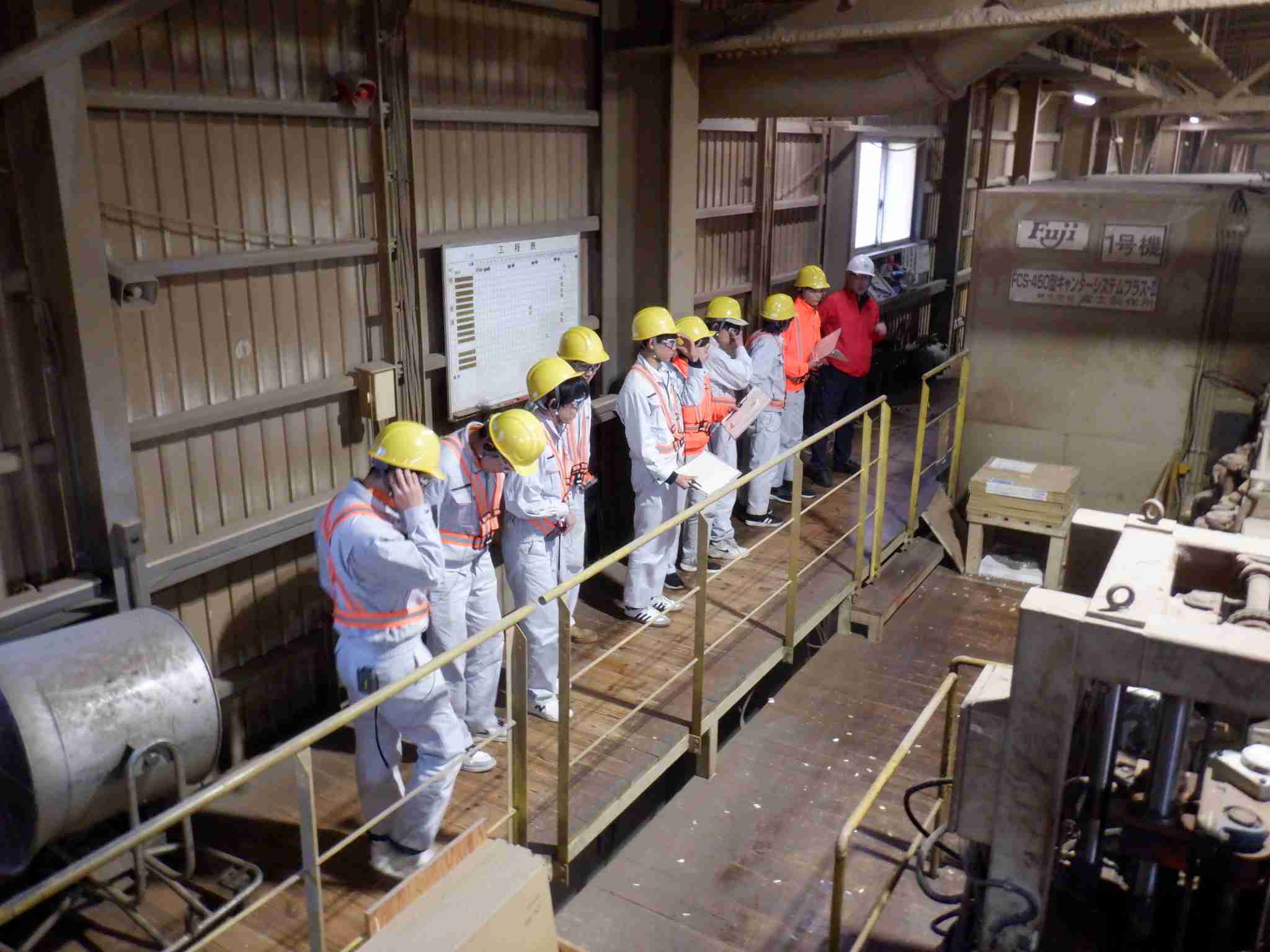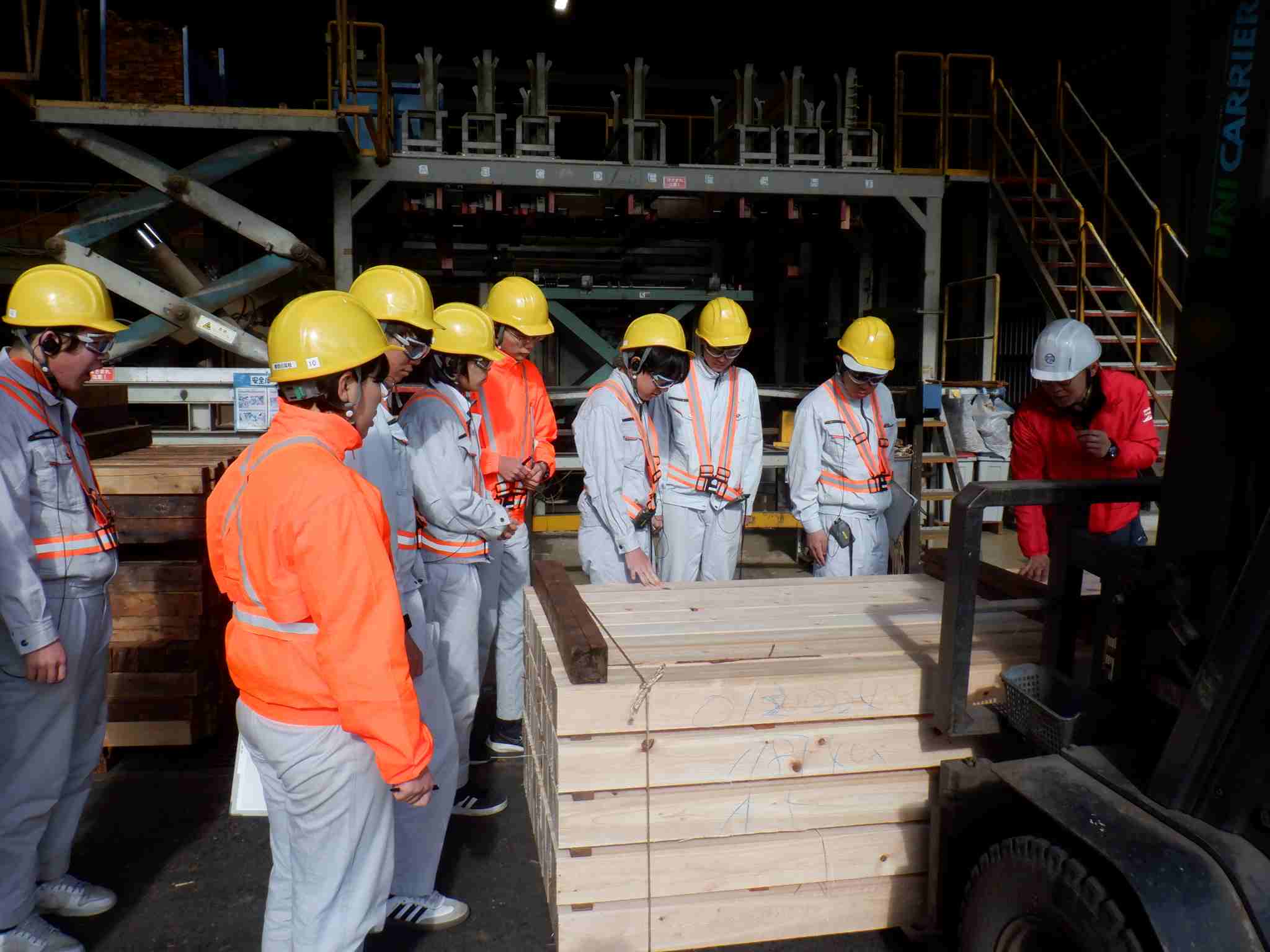 院庄林業株式会社は、県内外に拠点を持ち、林業を営む会社です。国産材や集成材、プレカット材の製材、製造、販売や、山林育成、伐採など木材に関するあらゆることを包括的に手掛けられています。当日は製材工場のなかを見学させていただきました。木材市場や自社で伐採した木を住宅などで使う柱や梁に合わせて切られ、ベルトコンベアを流れていく様子は圧巻でした。ほかにも、木材の乾燥機やきれいに製材された木材、背丈をこえる大型の機械など様々なものを見せていただき、生徒にとってとても有意義だったと思います。